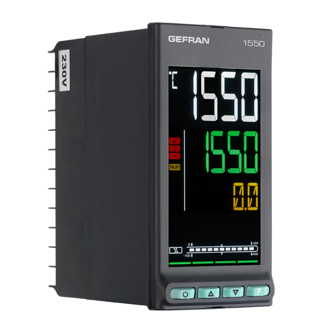 The 1550 offers precise and consistent control for a wide range of industrial applications. This single-loop PID controller has a large multicolor LCD display, making it easier to read, and the controller’s configuration is both intuitive and straightforward to use. It is programmed with multiple languages so operating information and diagnostic messages can be set to the language of your choice, and the controller is capable of sequential logic, allowing routine functions to be integrated in a single device.