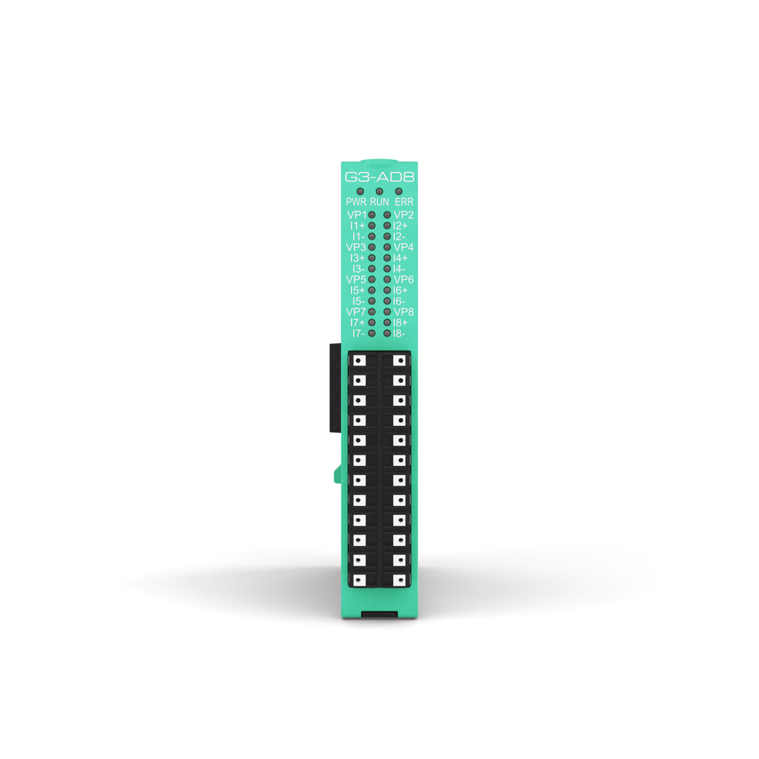 The G3-AD8 module has 8 isolated analog inputs that can be used to read signals from various types of linear sensors, from retransmitting units, servocontrols, position systems.