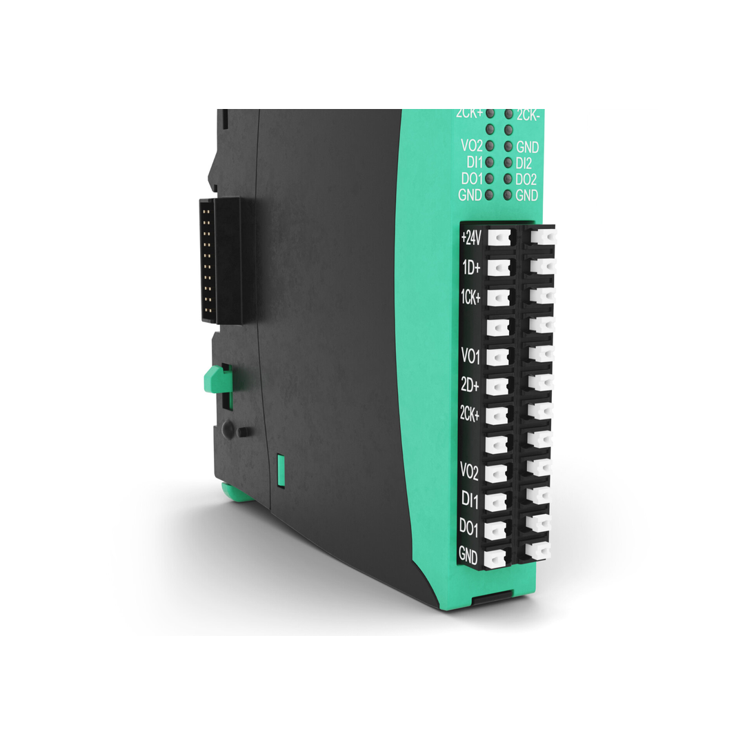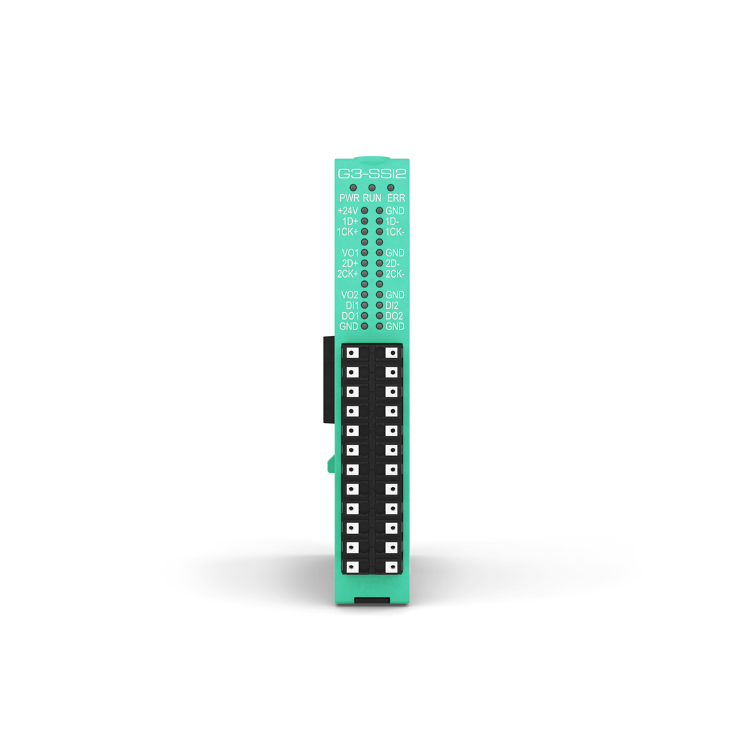 The G3-SSI2 module handles 2 fully configurable SSI inputs for reading signals with 24, 25 or 32 bit data format, binary or gray coding, output clock frequency from 10kHz to 2MHz.