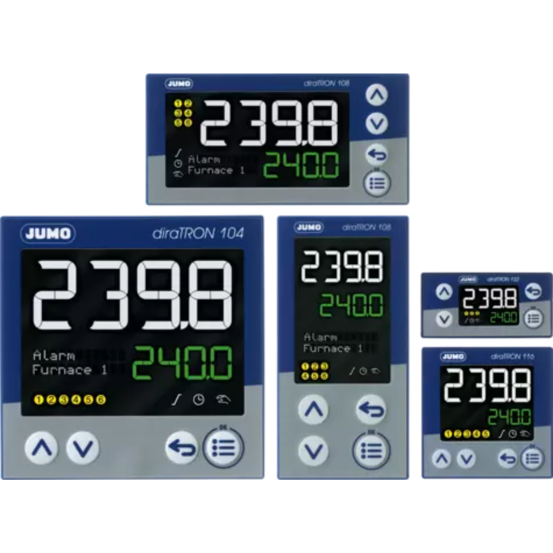 Universally-applicable devices in 5 DIN formats for controlling process variables. The basic type includes autotuning, a ramp function, a program controller, manual mode, limit value monitoring functions, digital control signals, extensive timer functions, and a service counter.