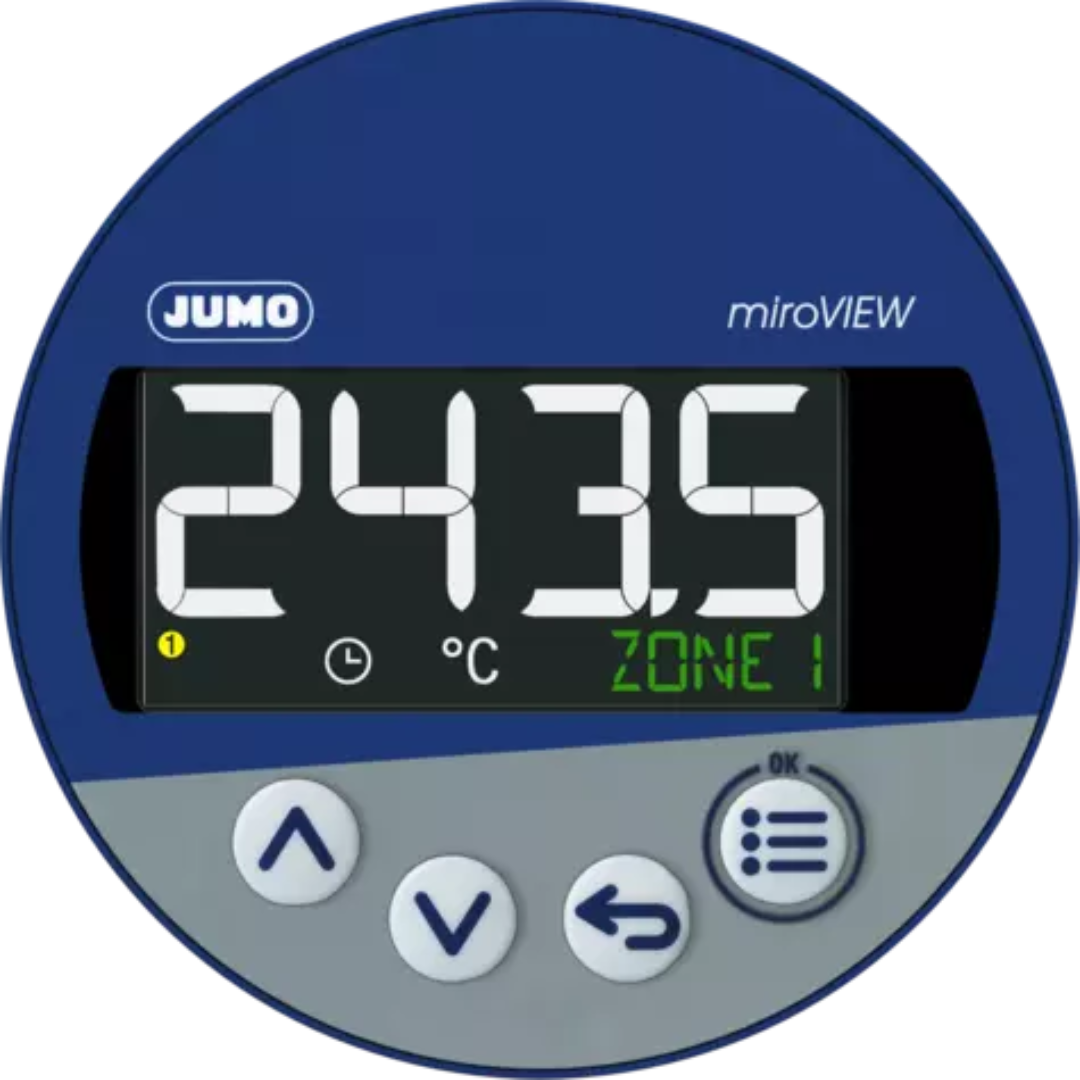 The JUMO miroVIEW is a digital indicator with measurement input for RTD temperature probes for panel mounting. In the 60 mm and 80 mm round installation format, the JUMO miroVIEW offers an alternative solution for mechanical dial thermometers or contact dial thermometers.