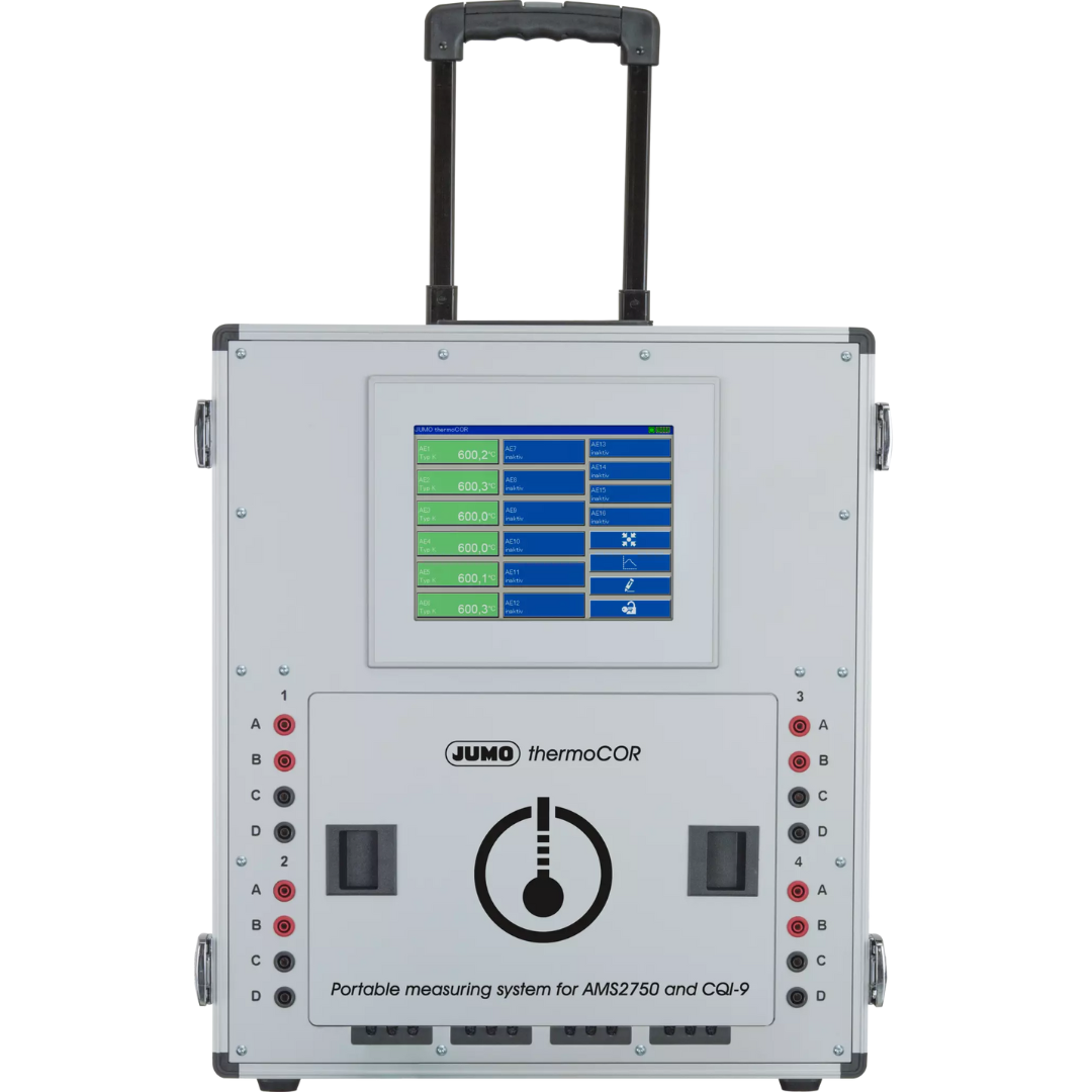 The JUMO thermoCOR is a high-precision documenting test device. The use of a specifically-designed integrated cold junction allows the device to meet the accuracy requirements of AMS2750 and CQI-9. It can be used in a variety of ways and offers a high level of operating convenience thanks to its color touchscreen.