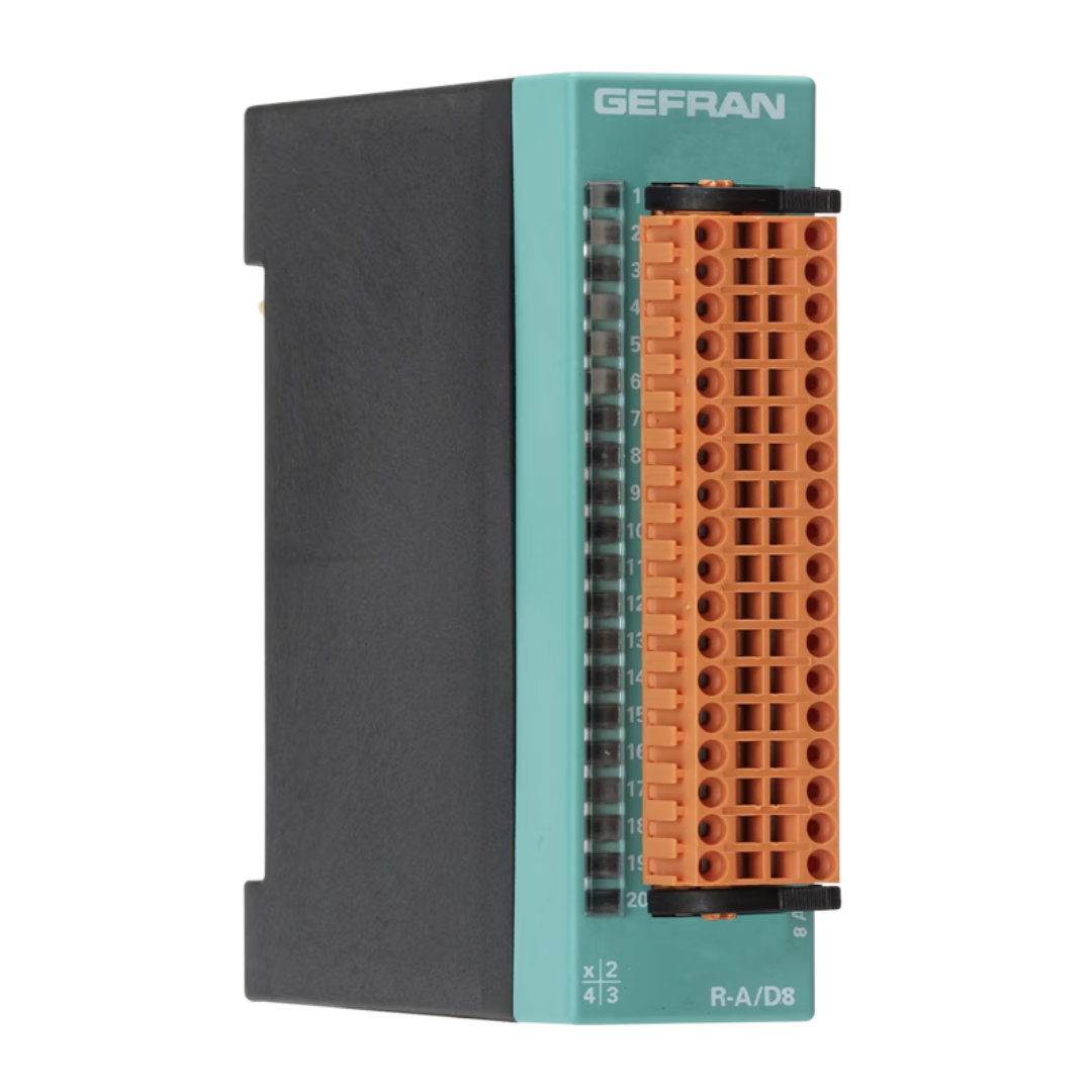 The R-A/D8 module has 8 optically isolated analog inputs at 16 bit ±10V and can be used to send reference signals to drives, servocontrols, solid state power units with linear input, or to retransmit variables to recording devices, other units, etc.